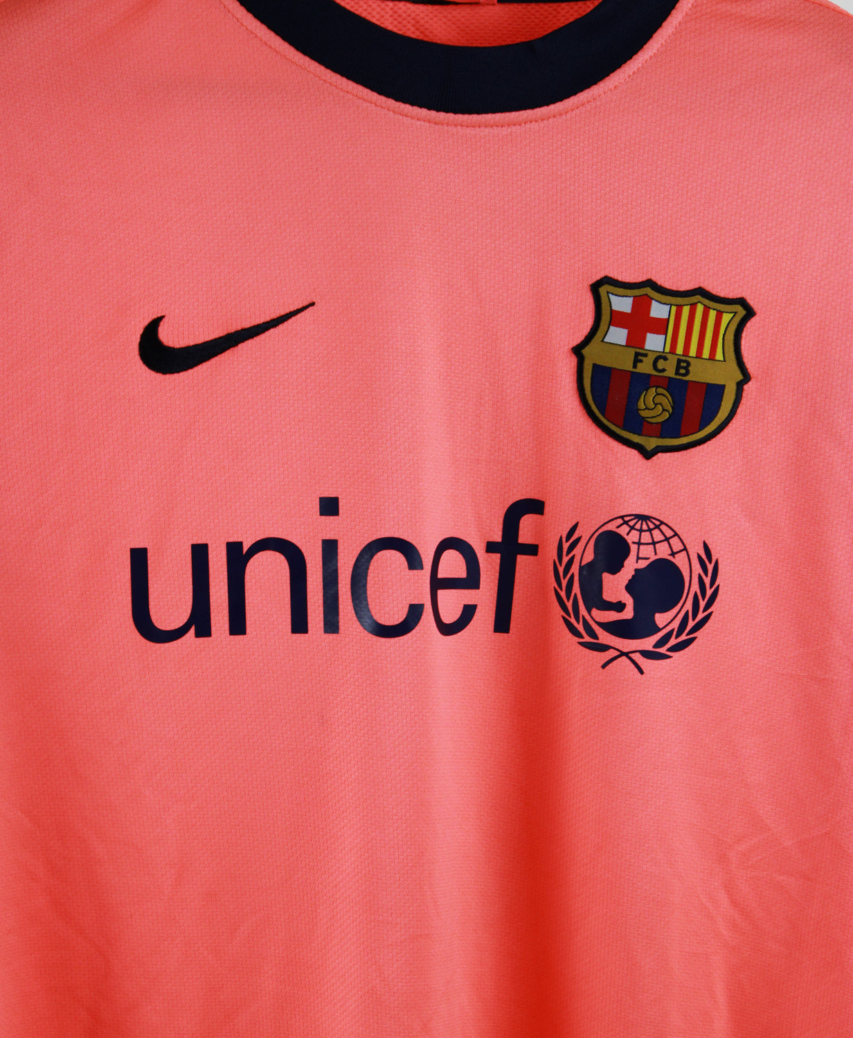 The Barcelona 2009-10 Carles Puyol Away jersey is a bold tribute to the leadership and passion of one of the club’s most iconic captains. Designed by Nike, this vibrant mango-orange kit features the UNICEF sponsor, official FC Barcelona crest, and Puyol’s name and legendary number 5 on the back. Worn during a season of domestic dominance under Pep Guardiola, this away shirt represents the heart and grit that Puyol brought to every match. Its lightweight Dri-FIT fabric and eye-catching color make it one of the most memorable alternate kits in Barça’s modern era.