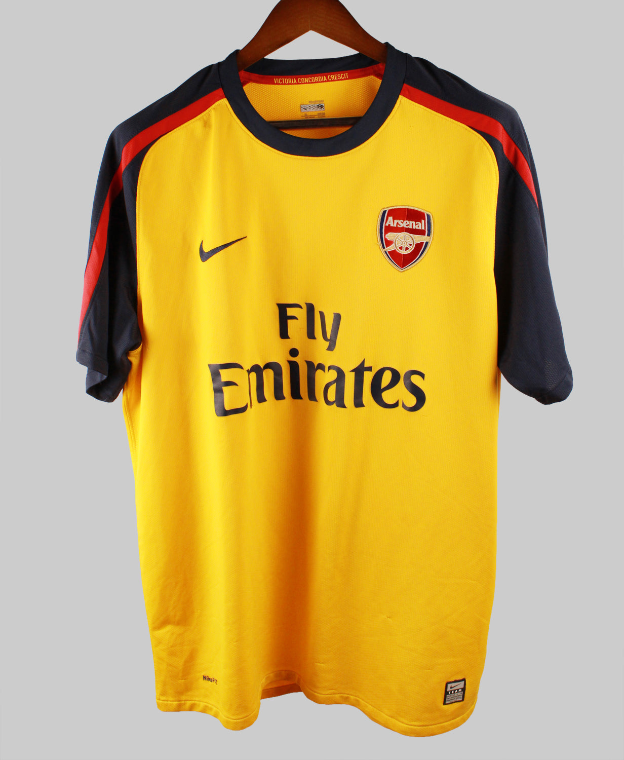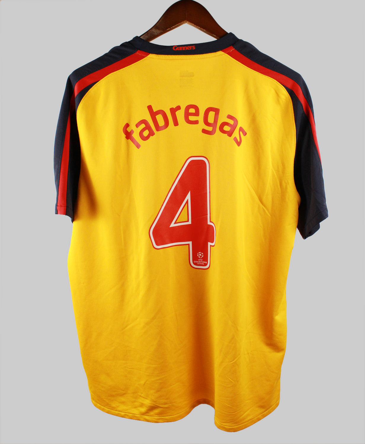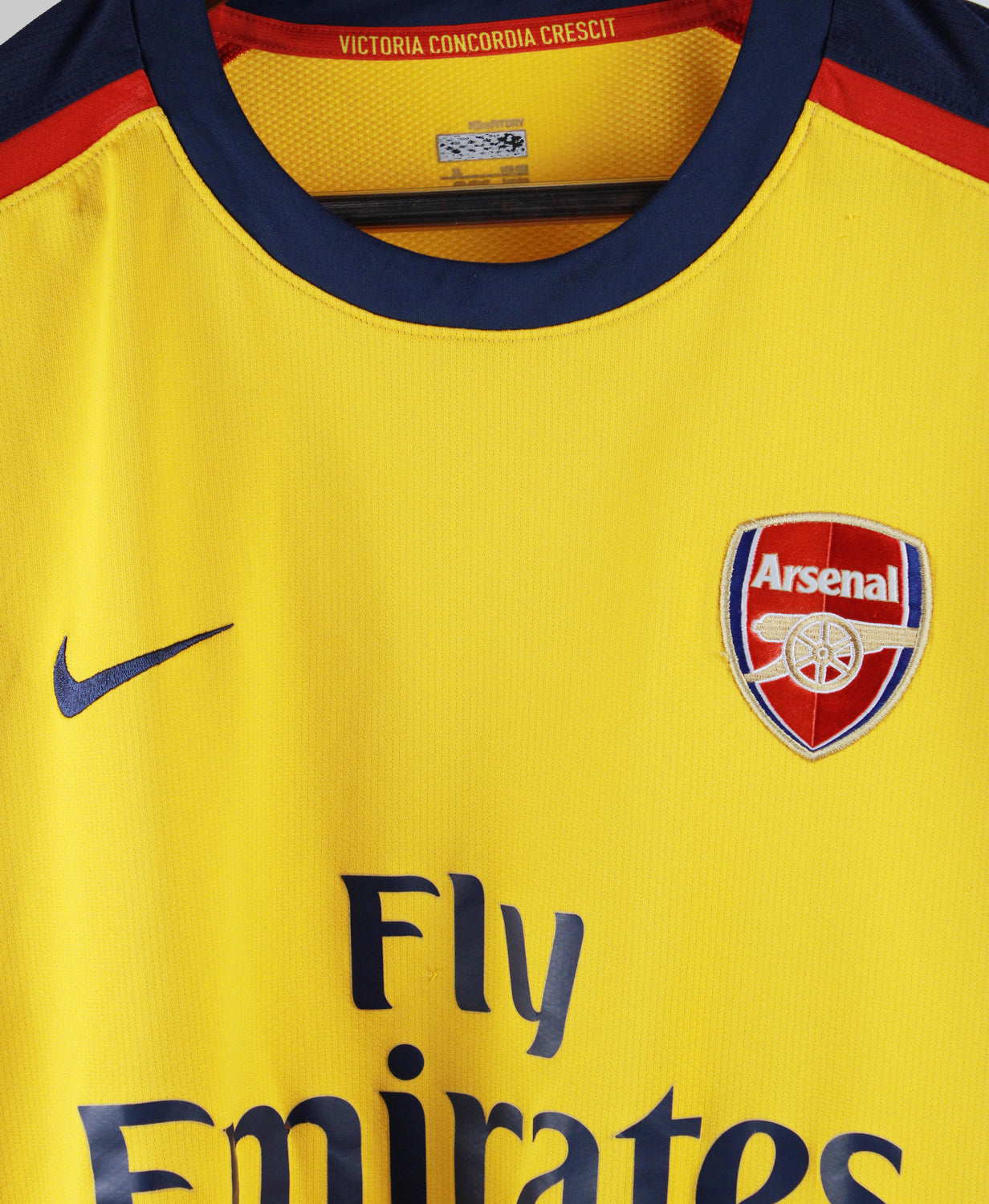 The Arsenal 2008-2009 Fabregas Away jersey is a standout piece from a memorable chapter in the Gunners' modern history. Worn by captain Cesc Fàbregas, this away kit features a bold yellow with navy blue sleeves and red accents, a modern twist on traditional Arsenal styles. Designed by Nike, the jersey is crafted with lightweight, breathable fabric, and showcases the iconic Fly Emirates sponsor logo across the chest. With Fàbregas leading the midfield, this kit became symbolic of Arsenal's youthful, dynamic squad during that campaign.
