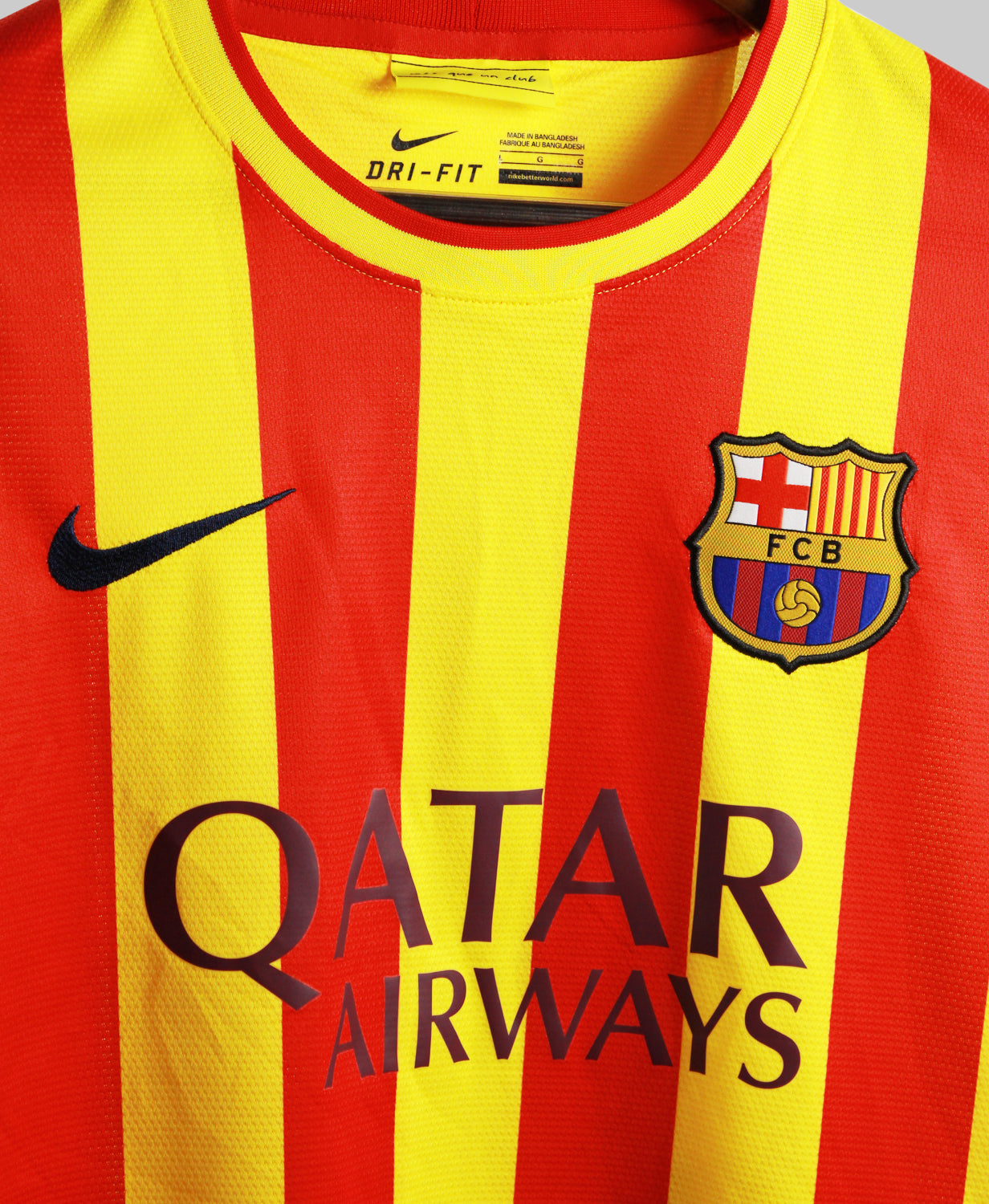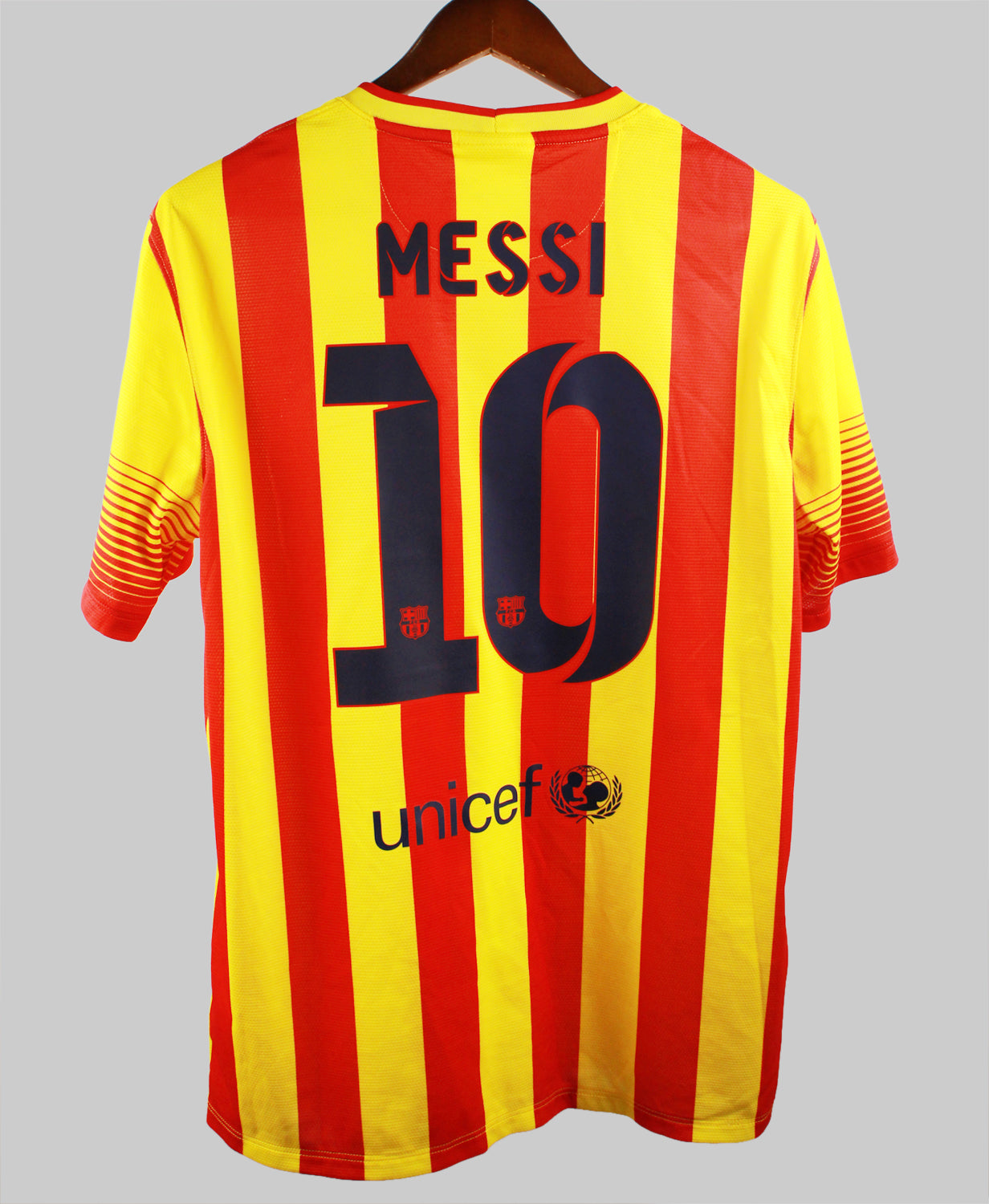 The Barcelona 2013-14 Lionel Messi Away jersey is a vibrant and unforgettable kit that captures the energy and brilliance of one of football’s greatest players during a dynamic era at the Camp Nou. Designed by Nike, this bold away jersey features a stunning gradient design that fades from deep red to bright yellow, symbolizing the colors of the Catalan flag and Barça’s fierce identity. Worn by Lionel Messi during a season filled with magical moments, this jersey represents his continued dominance as the heart of the team’s attack, delivering goals, assists, and unmatched creativity in La Liga and Champions League action.