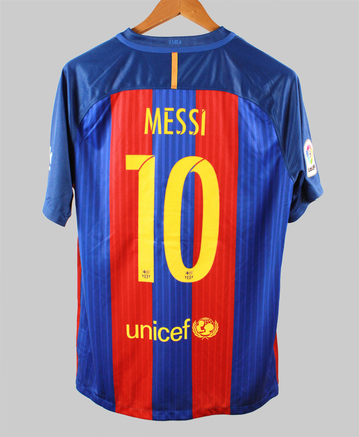 The Barcelona 2016-17 Lionel Messi Home jersey is a modern classic, representing one of the most electrifying periods in FC Barcelona's history. Designed by Nike, this iconic shirt features the traditional Blaugrana vertical stripes with a bold twist—subtle gradient detailing and a cleaner, more minimalist design that modernized the club’s legendary look. Worn by Lionel Messi during his 13th season at the Camp Nou, this jersey saw him deliver another incredible performance, finishing as the top scorer in both La Liga and the UEFA Champions League. The jersey also includes the classic “Unicef” sponsor and club crest over the heart, making it a symbol of both style and legacy.
