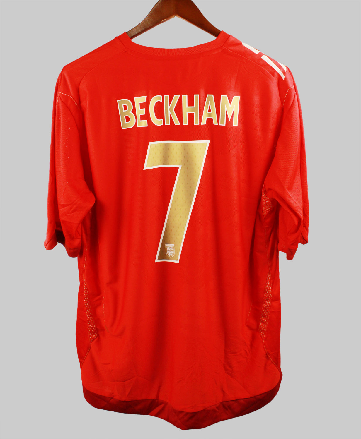 The England 2006 Beckham Away jersey is a striking symbol of the Three Lions’ 2006 World Cup campaign, worn by captain David Beckham during some of his most iconic international performances. Designed by Umbro, the jersey features a bold red base with subtle gold detailing and the classic England crest, capturing national pride and timeless football style. Beckham, wearing the captain’s armband, led England through dramatic matches in Germany, including his memorable free-kick goal against Ecuador in the Round of 16. This away shirt became closely associated with Beckham’s leadership and set-piece mastery on the world stage.