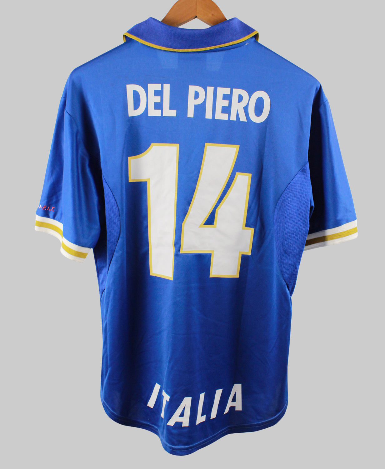 The Italy 1996-97 Del Piero Home jersey is a timeless classic that captures the elegance and tradition of Azzurri football. Worn by the rising star Alessandro Del Piero during a pivotal period in his international career, this kit is remembered for its iconic royal blue design, featuring a subtle jacquard pattern and the classic collar with white and gold trim. Manufactured by Nike, it marked one of their earliest collaborations with the Italian national team. With Del Piero’s name and number 10 on the back, this jersey represents the dawn of a new era for Italian football, as the young Juventus forward began to leave his mark on the global stage.
