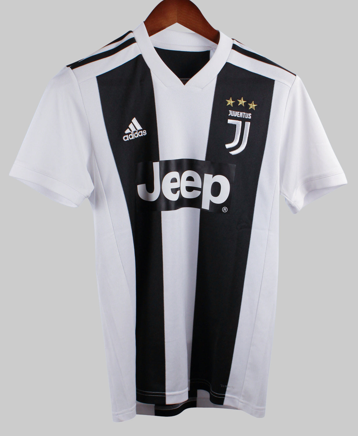 The Juventus 2018-19 Cristiano Ronaldo Home jersey marks the beginning of a transformative era for the Bianconeri, as the Portuguese superstar made his highly anticipated move to Turin. Designed by Adidas, this sleek black and white striped jersey features a minimalist two-tone design with bold black stripes down the center and the Jeep sponsor across the chest. Ronaldo’s arrival electrified Serie A and elevated Juventus to new global heights, with the five-time Ballon d’Or winner scoring 28 goals in all competitions during his debut season and helping Juve secure their eighth consecutive Scudetto.